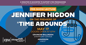 In celebration of the group's 80th anniversary, Higdon has written a new work for the CYSO. It will be premiered on Sunday, May 17, at 7:30pm. Higdon will give a pre-concert lecture at 6:00pm and will discuss her career and the creation of Time Abounds.
